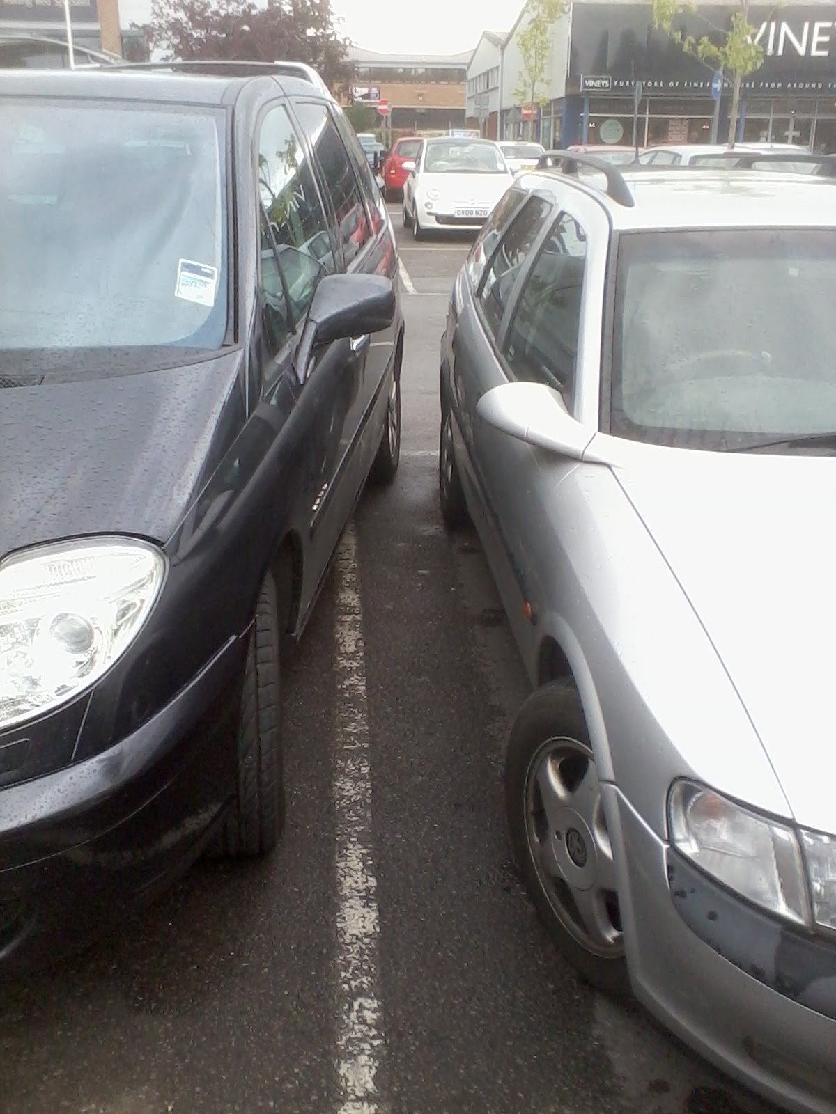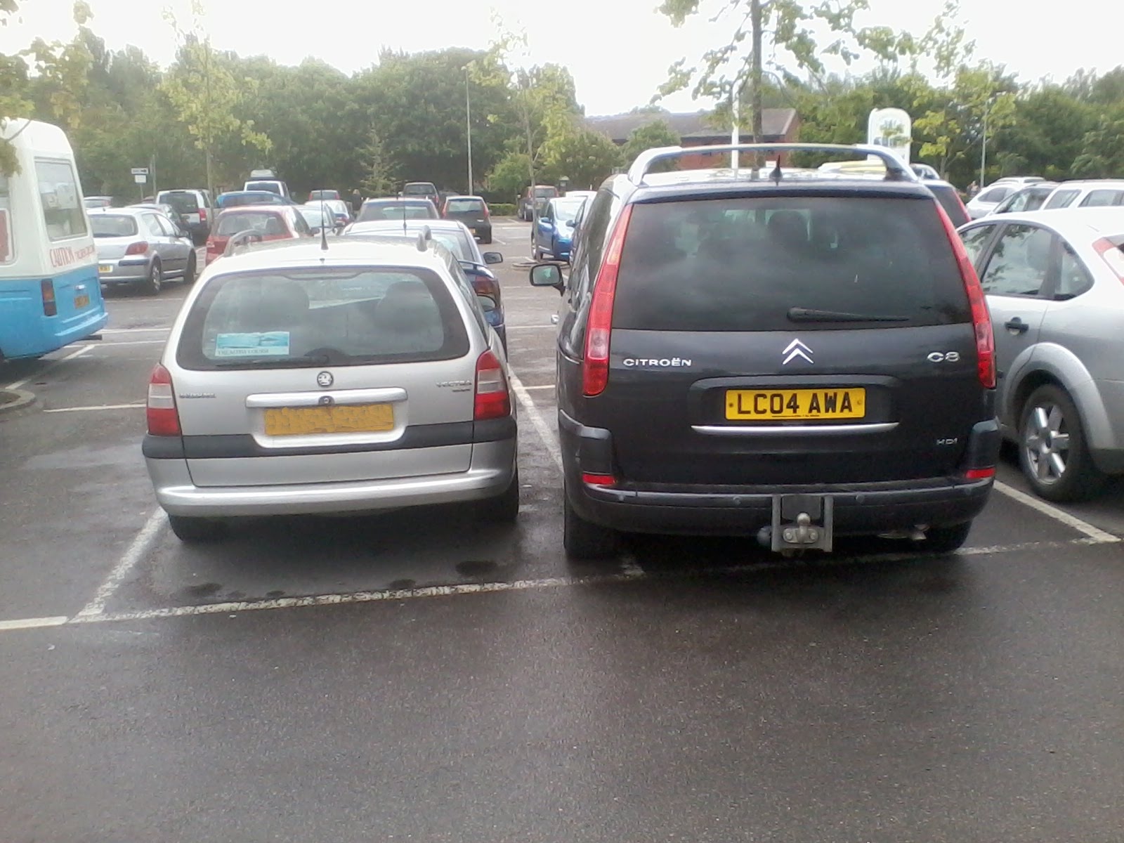 The car on the left, number plate obscured, is ours. We were there first. We came back from the shops to find the car on the right, black Citroen no. LC04AWA, had urgently parked next to us. So urgently it was choosing to ignore the niceties of white lines and other conventions like that.