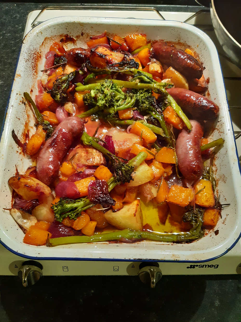 The recipe: https://www.bbcgoodfood.com/recipes/roast-sea-bass-vegetable-traybake